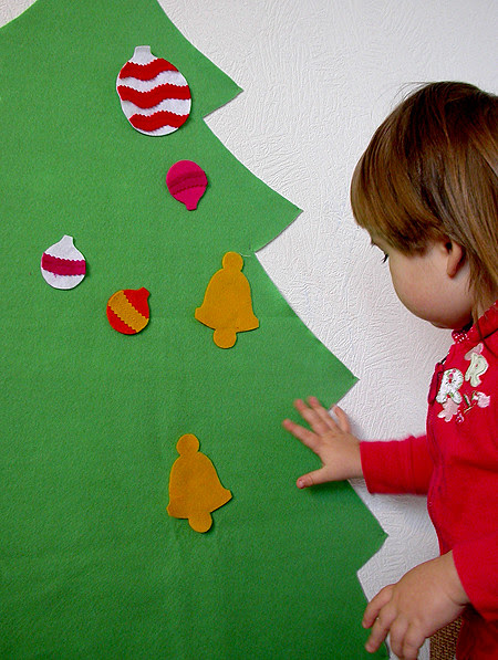 И игрушки, и ёлочка - из фетра. Игрушки нужно просто "пришлёпнуть" к ёлке ладошкой, держатся в основном отлично, но есть некоторые, которые отваливаются, видимо, из более тонкого и нежного фетра. Лучше брать фетр погрубее, особенно для ёлки, чтобы сцепка была прочнее.